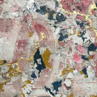 He will add a painted mark or shape or an application of gold leaf between broken images. At times, with the most worn pieces, he seems to be shaping a kind of artistic map from the broken image, as if he had placed sparkling rivers within the mysterious lines and patterns of a faded geologic map.