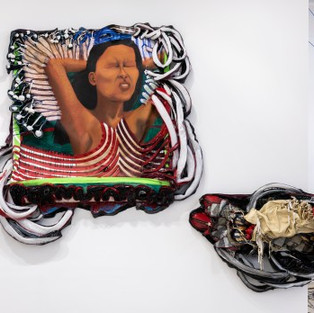 Piller’s extensive materials list includes latex balloons, resin, digital prints, shells, beads, straws, yard, leather, and many more. She braids, weaves and ties these materials seamlessly together into cumbersome sculptures that may resemble a towering ribcage shorn together with digital photographs of tragic headlines in the news in Across the wasteland, a twisted melody. Matter and spirit or perhaps intricately adorning a mask in Spirit of the Future. Her biomorphic forms expand and contract into vortexes and black holes laced by painterly patterns and textures.