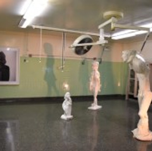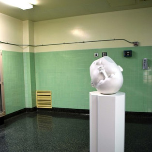 Strange green alien figures emerge from the hospital’s autoclaves, created by artists David Benjamin Sherry and Kim Simonsson. Daniel Arsham’s operating room sculpture is the figure of a man subsumed by a white melting substance. Distorted, broken sculptures by Johan Tahon and Laurent Grasso hover ghost-like, waiting for a cure that never comes in another operating arena. A photograph of a screaming man by Polly Borland is juxtaposed with a faded hospital wall mural of odd looking bunnies in the maternity ward.