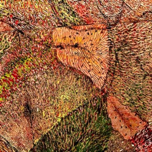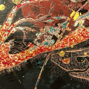 Eva works on wood panels, which she covers with many layers of acrylic; different colors, sometimes up to twenty. Her designs look complex and have some hidden elements that can be interpreted as the artists signature or, better to call it, her language. “I am very expressive and emotional,” says the artist, “and using carving tools adds a physical element right to that visceral action. I love doing it, the physicality of it, the texture. I love touching it and I enjoy when people touch my work because I feel like that’s when they really get to experience it fully.”
