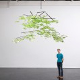 A lovely reminder that contact with nature is available in the city is Sharon Levy’s “Canopy”, an overhead mobile constructed of wooden dowels and handmade translucent green paper leaves. Gently swaying in the gallery’s air currents it mesmerizes and calms, promoting meditation on the importance of nature’s beauty and air cleansing powers. While not overtly stating the tensions between the green world and the one humans have wrought, Levy’s reverence for nature’s balm on a stressed humanity brings to mind eco-writer Gretel Ehrlich’s statement that “We humans do not save beauty; rather beauty saves us.” Like Baker Levy implies city spaces need to be mindful of plant and animal communities. In light of climate change, this attitude might be bound to species survival.