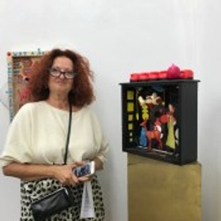 Dwora Fried presents an untitled, vibrant box diorama paying homage to Stophie Tauber-Arp; Bibi Davidson a tribute to brides, chicks, and her favorite color red as well as Max Ernst in “The Robbing of the Bride,” a mixed media wall sculpture. Karrie Ross has a wire, silver, and gold bust sculptural piece that tributes Man Ray, titled “We Dance?” while Leigh Dixon’s playful mixed media 3D collage “After Bellmer,” includes found art in the form of doll body parts and a section of a laundry detergent bottle.