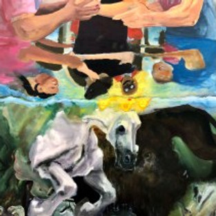 Paintings by Celeste Dupuy-Spencer are wicked and fraught, elusive and dense, saturated and shadowy tableaux. She wields an edgy, folkloric style that is both naive and sophisticated, depicting figures in landscapes and interiors enacting versions of the American experience. Throughout interlacing series, she chronicles contemporary communities that for lack of a better term formulate what appear to be variations on “the forgotten America” in a way — rural, working class, blue collar, townie. House parties and forest fires, religious healers and amateur musicians, scripture and satire — the works on view at Nino Mier Gallery combine an uneasy appreciation for the symbolism and homespun pageantry of religious dogma and the exceptionally ordinary details that give individuals their memories and build their character.