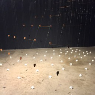 In perhaps the most literal materialization of this premise, Scacco produces an architecturally scaled depiction of a three-well staircase that was commonly and poignantly called the Stairs of Separation — a bureaucratic location at the arrival/screening center, from the bottom of which you would anxiously learn your fate. You either went ahead into America, remained in limbo on the island, or immediately returned to your point of origin. Architecture of Separation (2018, teak plywood, concrete, embroidery thread, fishing wire, hardware, 12 x 12 x 9.5 feet), is a ghost in the space, a faintly glistening, counterweighted web more than an object, a bit of an obstacle course. Its outlines can be glimpsed in caught light, best viewed by a viewer in motion. It’s like a memory in the room with you, quasi-materialized like an apparition, or a flickering bulb. It is poetic, but it is not only poetry; when it was a functioning place, it was a site where the courses of millions of lives were literally changed forever. It’s worth noting that its modern counterpart is probably a website, and therefore just as un-material, flickering, and elusive.