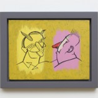 So it was no surprise, gloves off, that his final and mature body of work entitled Face Off would make even more explicit and theatrical the tensions that foment within the painting frame. Cartoon-like graphic figuration reminiscent of the famous Alfred Hitchcock profile caricature that introduced his TV show in the 1950’s is crisply delineated over swatches and controlled smears of off-beat/ retro colors. Mustardy ochres, composty olive greens, girly bubble gum pink and kids room blue, hospital green, mauvy reds and snappy tangerines jar aesthetic norms. Like the untasteful colors that “fight” each other or the pure abstract forms that vie with descriptive imagery, Suggs’ hybrids of animal, plant, and human. often sporting horns, branches, and quirky hairdos are posed in verbal or physical combat. For example, “A Marriage” is dominated by two bullet shaped figures, one mostly female as deduced by her long eyelashes and breasts, another presumably male as defined by its phallic top. The female seems to be either soothing or cudgeling the male with her large appendage, while the male expression is sulky and peeved– sexual differences in light of #MeToo writ large.