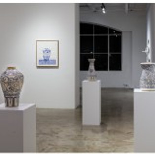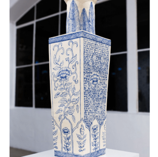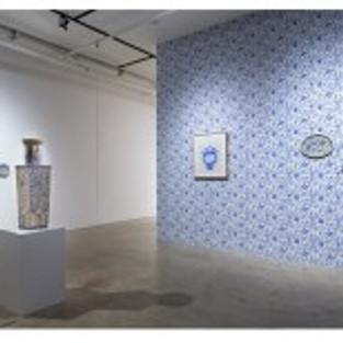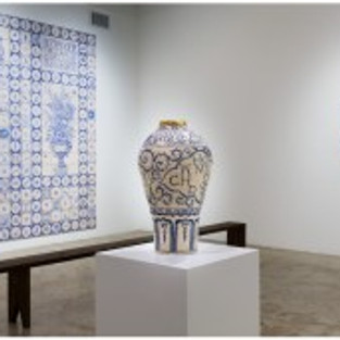 The installation constitutes an almost immersive expanse of calming, super-femme blue and white, filled to an abstract density with curling tendrils and budding blossoms, with vibrantly inked lines and luminous white porcelain catching the light and delighting the eye. But the staccato of absurd, offensive words and evidence of implicit cultural bias and institutional misogyny punctuates the cool trellises with tiny hot flashes of recognition and dismay. The contrast between the beauty and the beastliness takes immediate hold of the imagination, and the trick works every single time, in no small part because the semantic violence does in fact so often coexist within nostalgia for “simpler times” and the emotional veneer of traditional domestic spaces behind which lowkey and hot-headed abuse of women is as pervasive as dinnerware.