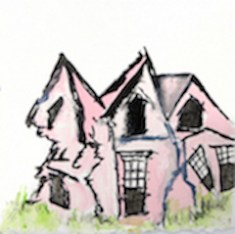 Prisoner 30 (all works 2017) on the checklist (and the image adjoining Prisoner 33, The Fire Artist in the book) is a close-up image of an eye on fire. While the text refers to the fire in the prisoner’s eye, Wood illustrates this notion with force and intensity as delicate vein-like flames protrude from an isolated eye. Prisoner 31 recalls Philippe Petit’s tightrope walk between the world trade towers. Wood positions the silhouette of a man carrying a large stick for balance between two yellow and gray skyscrapers. Seen outside the context of the book, this vulnerable albeit stoic figure clearly flirts with danger. Prisoner 6, is the Invisible Prisoner. This is mostly a pencil drawing proclaiming I AM NOT HERE. The word NOT is painted in a drippy style and the drips from the N lead to a small figure. The drawing suggests the figure walked through the words leaving a trail. While in the book, this prisoner has never been seen by the Warden, he/she is clearly present. Prisoner 20 is an architect and is represented by a disjointed pink house.