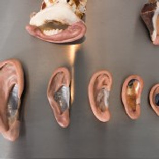 The exhibition is a curious exploration through these two artists’ minds, leading us down a rabbit hole of sorts, learning while falling in love with each new strange object. Such care has been taken in the objects. With a light heart, some seem like artifacts in a science center while others seem like strange toys created by a masterful stranger observing our planet from afar. Upon coming across the EarShells, one may think they’ve stumbled upon a new breed of shells or sea creatures. So purposeful, dozens of these EarShells sit silently, waiting; listening to the world around them, ready to inspire the listeners, the lookers, or devour the timid. Made in human-sized likeness, these are created conch shells that have a variety of human-like ear growth upon them. Much like the mouse-grown ears you can find in scientific laboratories, these EarShells remind us that while we press our own ears to sea shells to hear the ocean, what we are really hearing is ourselves (or the sounds these artist wish to reveal to us), as the ocean sound is coming from inside us. Other installations, projections, sculptures, and photography accompany these works in this exhibit, offering something fascinating for every kind of art lover.