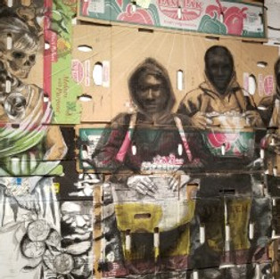 On the opposing wall, Narsiso Martinez offers a sensitive and insightful glance at the life of agricultural farmworkers and the struggles they face. They are mostly large-scale charcoal drawings or oil paint on produce cardboard boxes. Aimed at creating a contrasting image between the faces of the farmworkers, the lives the fight for, and the food they provide the masses with, Martinez admits the choice of materials was deliberate. In one piece, Past and Present, he uses collaged train tickets as his support, and created a linocut print of a screaming man with a noose around his neck to create this compelling piece. Having grown up working the agricultural fields in Oaxaca, Mexico with his family, Martinez has a beautifully dramatic style of rendering his figures, creating intimate group and single portraits with high contrast and a strong narrative. Through his work, viewers are able to gain insight into lives that are overlooked, careers that are underrepresented and a community that is trying to actively be dismantled in some areas.