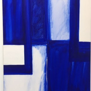 Her work is bold and vibrant painted in a brash style that one could argue is akin to an expressive minimalism (clearly an oxymoron). In the first room, which includes painted wood furniture and a glazed ceramic cup and saucer, the predominate color that pervades the room is bubble gum pink (or Pepto-Bismol pink lending the space a jaunty upbeat vibe). Though clearly a colorist, Heilmann’s work is about the relationships and tensions between shapes within a painting often flirting with the edges while leaving the middle vacant. La Cienega, (2010, oil on canvas 24 ¾” x 30”), is a delightful case in point. At first glance, it seems to be flat with a red square in the upper left facing off against a yellow square in the lower right. A green rectangle in the lower left is pitted against a blue rectangle on the upper right with a pink field in the middle. After awhile, it can also be seen as an aerial view of a city block with pink representing the road, with the geometric shapes as buildings. Heilmann’s paintings can look deceptively simple until one looks more closely. There are often traces of decisions underneath that are covered over but remain as visible traces. Juicy color is laid over an underneath color, creating a veil of decisions and revisions –a palimpsest. The painter’s hand is always visible here. Ming (1986, acrylic and watercolour on canvas, 60” x 42” x 1 ½”) is a case in point with its abstract expressionist drips reaffirming the flatness of the picture plane. Based on the iconic blue and white of Ming dynasty Chinese Pottery, Heilmann’s geometric composition can look like a tiny ceramic shard enlarged many times. Though tightly constructed within these demarcations, Heilmann’s paint handling is expansive and painterly as she slathers white paint over the blue under painting.
