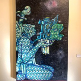By Sydney Walters In Heriberto Luna’s exhibit, he asks us to trust him as he walks us through his mythology. Exhibited with honest sincerity and bolstered by a rich understanding about ancient Mayan culture, we follow through enchanting and dazzling roads of gods, goddesses and time travelers. By piecing together elements of Mayan iconography, Luna resurrects a unique cosmology. This exhibition is melded with a deep longing to engage with universalities of the human condition to shape us into compassionate players in life’s complexities.
