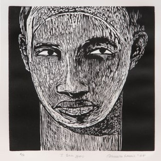Three separate spaces display the work of the fifty artists who contributed work for ICONIC. Well-established, mid-career artists (Shepard Fairey, Sundus Abdul Hadi, Keith Walsh, and Emory Douglas, who is an early member of BPP and created images for the Black Panther publication) as well as emerging artists (Ryan McCann, Tsilil Tsemet) create works that directly reference BPP or engage in a discourse on social justice. Fairey’s Bobby Seal (2004) a silkscreened, mixed media collage, is the image that greets visitors to the gallery as well as the homepage and sent postcard media. In his “signature style,” Fairey represents Seale in the red and black tones, the “OBEY” slogan prominently positioned at the center of the credo, “Peace, Obey, Freedom.” Keith Walsh’s Black Liberation and Socialism (2017), ink and flashe on paper, considers the relationships between activists and organizations with Huey P. Newton as the central figure. Tatiana El-Khouri’s Angela Davis (2017), mixed media on canvas, combines collaged images of Davis and BPP in headlines and news articles, “Free Angela” leaflets, and demonstration flyers with a portrait of Davis overlaid in tones of blues and greens. Regarding the “Hands Up, Don’t Shoot” cry calling attention to police brutality, Pilar Aguero-Esparza’s Ferguson 7: Sepia and Mahogany (2017), crayon, color pencil on paper, is a simple yet powerful image of resistance.