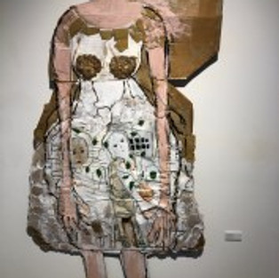 Malka Nedivi is a sculptor. She constructs human figures and house forms, using metal armatures covered in everything from paint to encaustic to plaster to fabric. She also does relief works on canvas. “Welcome Home” is a small relief portraying two ghostly figures. Both appear to be female. And both are strangely, hauntingly surreal. One sits, the other hangs, her arms and legs ending in strange pods and evoking animal appendages more than human limbs. At the beginning of his seminal 1928 work Nadja, Surrealist founder Andre Breton writes, “Who am I? If this once I were to reply on a proverb, then perhaps everything would amount to knowing whom I ‘haunt’.” Looking at Nedivi’s work, I wonder if we might invert Breton’s dictum. “Who am I? Perhaps everything would amount to knowing who/what haunts me.” The women of “Inherited Memories” are indeed haunted by inherited memories of the Holocaust.