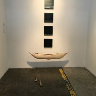 Andy Moses presents an acrylic on plexiglass work, “Circumnavigation,” an image that is as liquid as a sea bathed in red sunset. Janine Brown creates another form of liquid wonder, delicate, tear-drop-shaped, hand-crocheted wire sculptures, “Tears of a Wallflower.” Suspended from the ceiling, they seem not just tears but also the expanding conduit of feeling, of sorrow, of understanding – ultimately waiting to descend. Lynn Aldrich’s “Sprinkler” is a floor sculpture featuring garden hoses, aluminum, and steel. It is a blossoming plant of a piece, nurtured perhaps by Brown’s “Tears.” Martelloni’s own “Souls of Salt SOS” is a gorgeous centerpiece, a wooden boat with space blanket, fish bowl, and salt as well as a paper list of over 34,000 documented refugee and migrant deaths due to restrictive immigration policies in Europe. The gold of the blanket is a false value: what is precious is what it could ostensibly cover – human life. Another vessel arrives in the form of Kio Griffith’s bleach on diazotype film work “Coral Sea (Heavy Fog).”A photograph on plexiglass, Mei Xian Qiu’s “8075” gives us a soldier with a flower blocking his/her lips. Osceola Refetoff displays a series of five photographs, each infrared exposures shot in the Mojave desert. Desolate and haunting, they exude both the promise and abandonment of open spaces, the American Dream, and the ephemeral quality of even the most “solid” of human endeavors, dwarfed by the vastness of landscape.