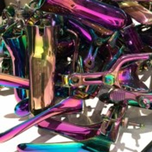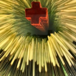 Holly Ballard Martz’ In Utero (Study for Installation) gives us a steel wire and wire coat-hangar wall sculpture that is both graceful and painful to comprehend. Rainbow coated speculums dazzle into a dimensional sculpture by Zoe Buckman in Rainbow Speculums. Two absolutely stunning mirror wall sculptures by Tim Tate may be among the most fascinating works in the show – The Moment uses mirror, LEDS, ceramic, and porcupine quills to shape a dimensional work that seems to go on forever, paired with the mirrored, dimensional We Rose Up. Both pieces feature a red cross at center, and both refer to the quest for decent healthcare in the U.S. Christine Won Yap’s Forward is one of the most hopeful works in the show, wood type on ribbon, linen, and thread, the piece reads “Forward out of Darkness Leave behind the night, forward out of error, forward into light.”