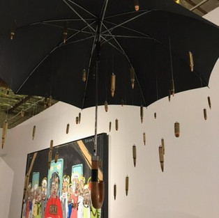 Some of the strongest works include Mear One’s elaborately detailed vision of Revolution, Patrick Martinez’ neon Electoral College, and Cara Levine’s haunting beige sculptures This is Not a Gun. Her works pay tribute to individuals killed for carrying items mistaken for weapons, from a flashlight to an iPod. Chip Southworth’s oil enamel on birch panel works read, in bold colors “I was Holding a Toy” and “I Was Wearing a Hoodie,” both referencing instances in which persons of color were murdered by the police or a self-styled vigilante. A delicate, raindrop-like suspension of bullets hangs from monofilament beneath a black umbrella in Michele Pred’s Security Storm, while bullet shells are connected by a maze of thread in Lisa C. Soto’s The Shortest Distance Between Two Points.