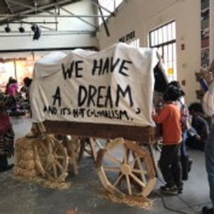 Across the courtyard in the lounge/dining/poster-making area, hanging from the back of a small Conestoga wagon, are these words “We believe that people should not live or die from poverty in the richest nation ever to exist.”