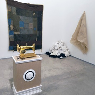 The idea of the used and worn versus the new and valuable is familiar subject matter for Carter. Sewing and Reaping (2017), the gold-platted sewing machine on custom made plinth, is juxtaposed with the found object of a 19th-century quilt, its decaying and stained fabric places it in stark opposition with the shinny gold machine before it. A pile of used jeans haphazardly sits in the corner of the gallery next to a sewing pattern tacked to the wall. Effigy for a New Normalcy VI (Accepting Greatness) (2017) is a pair of gold plated, high-top sneakers pinned to the wall above an alcove opening. The seemingly ambiguous nature of these items together fades as the viewer meditates on the significance of these objects, not just as work produced by an artist of color as Carter’s practice has transcended this category, but also as visual markers of this specific moment in time.