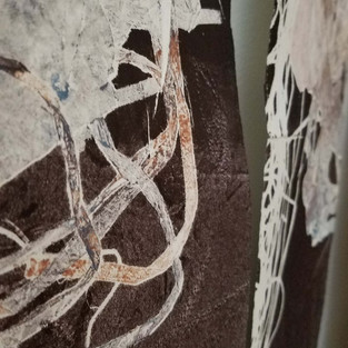 Throughout the gallery, Ms. Kei has placed the little ‘crumpled-paper-and-stuff’ sculptures. They have the feel of fascinator hats. Plumes of wire, string, fabric and dried paint curl out of the folds of the paper. They serve as artifacts that offer insight into how these large prints were made. These sculptural nebulas, after all, were the objects that were run through the press to create intriguing textures and colors.