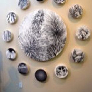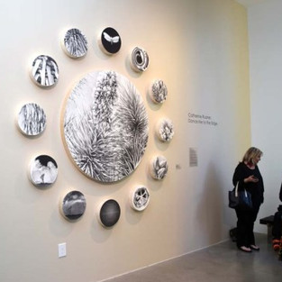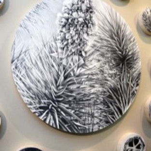 For the Lancaster exhibit, the distinctive look of the Mojave flora and fauna is explored in depth. Aline Mare takes a microscopic view of the huge Mojave Desert in her Diaton dye transfer print Angle of Repose. This highly detailed and layered image of a dried seedpod multiplies and encompasses the whole composition with delicate serpentine lines and swirling colors of blue and purple. Catherine Ruane’s exquisitely rendered charcoal and graphite drawing, Dance Me to the Edge, shows the intricate structure and rhythmic lines of a Joshua tree in full bloom. The rich plant life of the desert is beautifully encapsulated in this precise and poetic drawing. Martha Aponte takes the Joshua tree and makes its spiky presence three dimensional in her layered and overflowing mixed media sculptures, Tribute to Joshua Tree.