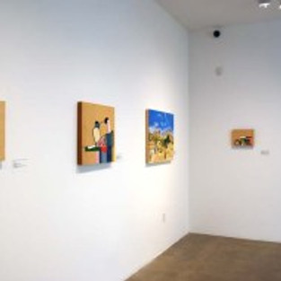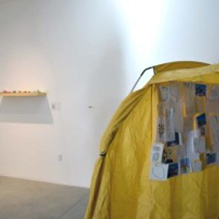 Carol Es works in a dream world of toy animals on springs, weirdly colored desert landscapes and a crooked ladder in Ladder to Dad. In her painting, Unexpected, a patchwork quilt desert is the background for an eerie post punk space vehicle. She also evokes old time camping with a tent, camp chairs, and a sleeping bag. In this mixed media installation, Camp Up To Now, she screens a collaborative video on the vintage T.V and generally evokes the clash of nature with technology in a witty way.