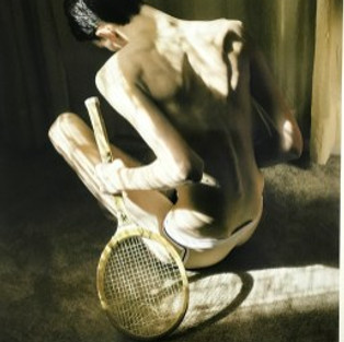 Another photographer, Ryan James Caruthers, fixates on his painful attempts to prove his masculinity in sports while coping with a bone deformity. In After Tennis, a young skeletal man crouches on the the floor holding a vintage tennis racket, the strings loose and twisted. Bright sunlight streams through a window and shadows accentuate every bony protrusion in his back, elbows and hips. Caruthers imagines himself in situations his body would not allow him to experience in childhood.