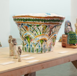 In the most literal and beguiling articulations of this dynamic, works replicating the missing (aka looted) holdings of an anthropological museum are made from recycled elements appearing to be culled from date packaging. From the intimate and even tiny to convincing tabletop pieces and impressive large-scale mosaic pictorials, Rakowitz expertly mimics the stylized eccentricity of ancient pictographic tableaux, pottery shards, regal gods and their fanfare, from calligraphy to coloration. The metaphoric impact of the merging of priceless cultural artifact with cheap modern materials related to the intersection of conflict and commerce is powerful and apparent, a uniquely accessible symbolism with a clear political point of view. But as previously observed, they are also ambitious, witty, and sincere decorative devotionals, whose critique of a disrupted cultural order also succeeds in redeeming its marginal components, in a manner recalling arte povera and Fluxus movements of art history. That kind of alchemical materialism is a full-hearted metaphor in its own right.