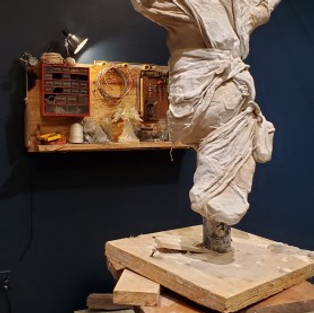 Walking through the space is a bit like touring the Acropolis in Athens: Although there are glorious indications of past existence, it is now in ruins and most of the elements are fragmentary, dislocated, and scattered across space and time. Two of Patton’s sculptures specifically recall the Winged Victory of Samothrace, an immense Hellenistic figure that now dominates a stairwell in the Louvre Museum. The Greek Victory has lost both her arms and her head–yet she maintains an extraordinary power and grace. Patton’s versions are smaller and more disjointed. Indeed, they might be mistaken for inchoate blobs if encountered outside an art venue. But in the handsome, midnight blue gallery, elevated on the artist’s makeshift plinths and elegantly illuminated, aesthetic resonances are undeniably evoked.