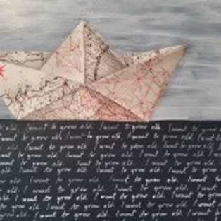 “Wanderers” gives viewers birds and flowering stars against a lush blue background; “Finding a home” reveals stars and poetic words trailing them like comets above a striated landscape. In “Stray Dog,” a canine rests before a bone among weeds, stars bursting with light above him on a dark blue sky. “I want to grow old” makes use of old maps as a kind of wall, above which a bright star peeks into a pale blue sky streaked with the white of clouds. In “Verses Headed for the Weeds,” paper airplanes spin and dive above wavering weeds that seem to be open-mouthed, like baby birds, hungry for knowledge. There is a comet, a “Folding House” sailing through a night sky, a road through uncharted territory illuminated by three bright stars, and “Home,” a nine-piece polyptych made with old maps and silver leaf, the small paper works hung together in quilt-like pattern of dwellings and stars.
