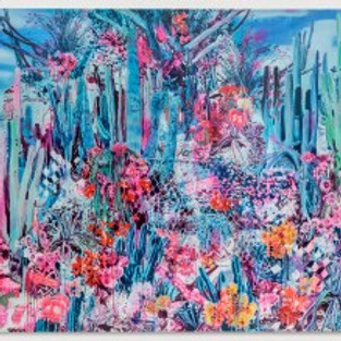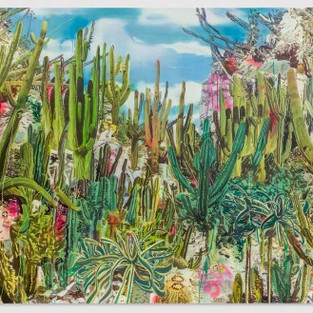 Her exhibition, The Happiest People on Earth, raises questions about who the happiest people on earth might be. As there are no people depicted in her paintings, it is the plants and detritus that exude a vitality and spirit, becoming metaphors for humans in the natural world. The large-scale works are brightly colored, and present dense areas cluttered with cacti, some glowing in hot pink and red apparently toned by reflections of the setting sun. Embedded into these realistically rendered, albeit expressive and gestural landscapes are photographic transfers of discarded objects, toys, bumper stickers and myriad kitsch tchotchkes that reference the past. Crow is conscious of the relationship between these two modes of representation— photographic veracity as opposed to painted renditions.
