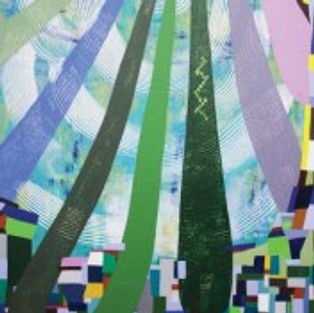 Sarajo Frieden’s Where the Light Gets In evokes the sensation of stained glass. A whisper of Mark Rothko’s color infuse her mosaic-like shapes. Colored lines pulsate like swirling fingerprints. Dots and rays of paint swoop above, across, and within intricately figurative abstractions. Study Frieden’s work to find complex ribbons, patterns that could be the whorls on a tree trunk, the definition of landscape on a geographic survey map. Her shapes hold within them a kind of linear reason, components in work that is as perfectly defined as it is abstract. Calling herself “an artist who plays with material,” Frieden is also very much an artist whose material is playful. She describes her work as being “influenced by the diverse communities of the California Pacific Rim,” and certainly her paintings here draw upon a wide range of visual cultures that seem almost tribal, creating images that channel both textiles and digital media. The woven quality of her work creates a tapestry of sorts, although the overall impression remains that of stained glass: infused with light, patterns both serene and compelling appear as leaves, petals, or rays that exude a kind of visual sound. The artist has said her work explores both spirit and complexity, and that it does, compelling viewers to look within each piece, to view its layers and references.