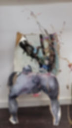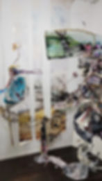 Opposite the installation, the earliest work in the show, Untitled (Horse) 2007, is a tour de force. It is mostly a 2-dimensional work, though a small area has elements extending into space. The deep browns and amber tones create a nether world expressing a stormy mythic drama. Mordechay said that early on, she discovered all of the elements in her visual language of metaphors. In this early work, her rich lexicon of symbolic images is present: animals, breasts, vulvas and penises, angels and demons all dance to the rhythmic cadence of the beating hearts and viscera. They move with the primordial animalistic forces of consciousness, untethered to the constraints of our social mores. In the process of allowing the chaotic forces of our world to pour out unrestrained, Shiri becomes a Sybil whose utterances are the gist for our consciousness to decipher and bring to them our own understanding and meaning.