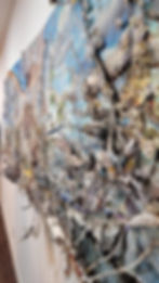 Mordechay spoke about the most recent piece in the show, Echoes from the Blue Sky. “This piece is more of a fantasy, with angels and eggs, swans, tigers, and yellow chicks; the natural and super-natural world perform as actors in a play. The piece unfolded that way; it had less to do with human tragedy. The stories in my paintings change as the pieces demand. I just draw and paint without planning: images and forms come to me, and working from fragmentation, each section suggests the next move. Sometimes the image shows you what the form should be and sometimes the form suggests what the image should be. When I looked at the bridge, at first it was a deteriorating ruin- then it became a bridge to heaven.”