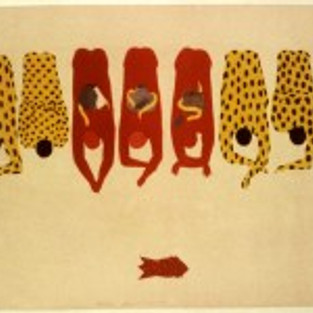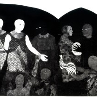 In “The Consecration I” (1991, collograph, 90.5” x 119 ¼”), we see Ayon’s interpretation of this story as Princess Sikan (in white) stands next to what may be the Diviner. There are actually two figures on either side of her—both with nimbuses and both with scepters or shepherd staffs. On Princess Sikan’s head is a rooster which is a symbol used by the Greeks as a sign of Apollo, Zeus, Persephone and Attis. The Hebrew’s have the word “gever” which means both “man” and “rooster.” This means that the animal can be used as a substitute for humans and sacrificed at Yom Kippur. And in Christianity, the rooster crowed three times as Peter denied Jesus and became a symbol of Christ’s passion. Roosters are often found in tombs, as the ancients associated them with the light, since they crow at the break of dawn. Loaded symbols like the rooster and the goats in this image and others here speak to death and perhaps to rebirth. Ayon’s figures have no gender – they all have no hair, and though rarely clothed – they have no visible breasts or phalluses. Their eyes are all simplified like Egyptian art -sometimes pure white with no iris or all black- almost like wooden religious statues. They are often frontal and parallel to the picture plane or only slightly turned, giving the composition a sense of formality and unreality.
