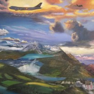 I asked about the painting and Constance explained the various threads of critical thought and homage that the piece contained. “The work is a critique of the romantic representations of the West by some of the Hudson River Valley painters and 19th century photographers who helped to create a mythic image of the American West as part of an expression of manifest destiny. The railroads hired photographers to create powerful images to convey a sense of wonder and desire, and to communicate the idea that this land is ours for the taking. It played into the colonial drive of Westward expansion. The painting is composed of images of the landscape from advertising, images that refer to the majestic 19th century painter’s iconography. At the same time it is an homage and a love affair with these brilliant artists – Church, Cole and Bierstadt – these are artists I love and their work has been a deep inspiration and influence on my painting.”