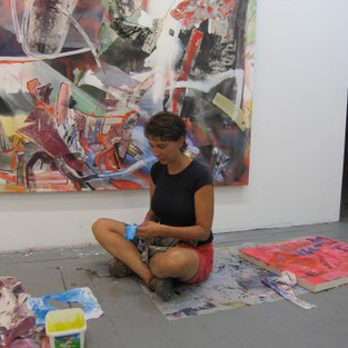 Iva brings all of her experience to her paintings, what she is reading, a fragment of a story or a memory, something that moved her and embedded itself in her soul. She showed me a painting with loosely applied gestural strokes of yellow filling the central area; strips of red material have been glued to the surface creating a feeling of movement and light. She said of this piece that it was a reference to a road trip she was took many years ago, that they stopped their car in the desert and there was an abandoned silo off a short distance, as she walked towards it an enormous white owl flew out sweeping past her. She continued walking and inside of this vast space another white owl was flying in circles slowly ascending toward the light to escape through an opening at the top. She said it was one of the most beautiful things she has ever seen, and that she was trying to capture something of it in this painting.