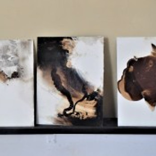 James begins a painting by applying white paint to the aluminum panels that he works on. The surface moves from smooth to heavy impasto, to create a topography that will affect the application of tar to the surface in unexpected ways. James mixes his earthly substance with various thinners; lighter fluid, rubbing alcohol, kerosene and an assortment of other materials; each which effect the spread his medium as he pours and brushes it onto the surface of these panels. Initially he lays them flat on a table to pour and manipulate the tar into spontaneous, abstract, process-based shapes. When they dry, he hangs them on the wall and in a method of intuition and instinct he waits until he can sense what plant or animal will inhabit the space that he has created.