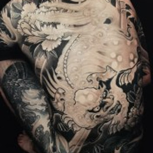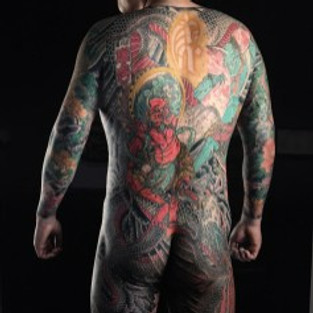 Large color photographs of the work of the Chinese/Taiwanese tattoo artists Dong Dong and Gao Bin are among the most stunning images in the entire exhibit. One striking image is of the torso, back, buttocks and thighs of a young male. From the waist to the shoulders is a monochromatic realistic rendition of a Buddha replicated twice, while from the waist down is an intricate full color elegant drawing and design with both figurative and abstract elements. There are three other large-scale color photographs of work by both artists that showcase their incredible draftsmanship as they integrate more traditional Chinese imagery of Buddhas, dragons and lions.