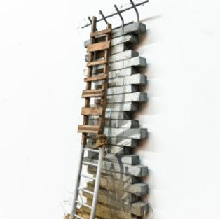Essi Zimm’s Happenstance tells stories. Inspired by mythology and a childhood spent in a book store, Zimm creates a dynamic and richly colored world featuring lions, unicorns, a peacock, pink bunnies. Using mixed media of oil and collage, Zimm’s bold and bright color palette combined with her textured patterns and layers lead viewers into a fairy-tale land. Her “King Star” is a roaring patchwork of a lion, Leo, killed by Hercules in battle and placed in the sky by Zeus according to Greek mythology. A cornered great beast, a king crowned by his mane, this is art that leaps off the wall with a roar. Comparatively peaceful, her “Bai Hu” the white tiger is curled up like a kitten ready to nap. Placed against a vivid striped and patterned background, this too is a mythological creature, a constellation, a proud but peaceful being. Her “Hare or There” offers whimsical pink bunnies, “Du.Nu.Nu” gorgeous curved Pisces fish.