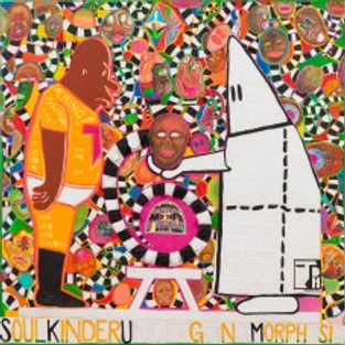 The largest painting, Step and Screw Part Too Soon Underneath the Bloody Red Moon, (2018) features Hancock’s football player alter ego, TorpedoBoy— who has exaggerated features: big arm muscles yet a perplexed expression— being chased by a representation of the KKK, a white hooded figure filled with a red noose and myriad figures from Hancock’s Moundverse. Beneath these characters is a comics-like narrative comprised of numerous black and white square panels in which a figure (Hancock) is instructed by a hooded Klansman to step on a stool to screw in a lightbulb over and over again. This background narrative reinforces TorpedoBoy’s fear and plight.