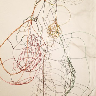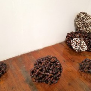 Clare Graham makes impossibly rich sculptures crafted from materials that are otherwise intensely prosaic, such as buttons. Under his touch, these buttons become a glorious cylindrical form. He has shaped a black and white wall-hanging, a weaving of buttons, two circles that float; he’s crafted wiry arms of buttons, dangling from the ceiling. Clustered together they resemble masses of coral, or the bones of creatures from another planet. Shaped from pop-top tabs, a brilliant silver tumbleweed of an orb is poised on the floor, a meteor from a planet of metal.