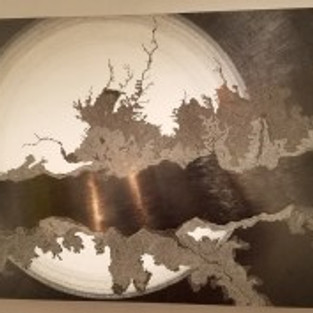 The noir-dark beauty of Christine Weir’s graphic on clay panels give us images of water and flow, passages both literal and emotional. That the artist’s lush and delicate work grew from a fear of flying that nonetheless made her riveted by views of the earth from above, presents the viewer with a deep and haunting story. Her vision is perfect, a translation of her own “internal landscape” as she says, fused with images of river systems sought from Google Earth. They have an ephemeral quality that transcends both physical and inner vision; they are the stuff of dreams.