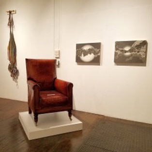 Dimensional works dangle from the ceiling, a chair sits on a pedestal, an amazing planet-like ball vibrates within its own shape on the floor. Ceramic tiles form a larger mosaic work, some pieces lie on the floor as if they slipped from the wall. The image is liquid, the shades of green like malachite fused with water. Many pieces have an otherworldly aspect, as if they were dropped through space and time, had traveled far to shape or reshape themselves into art.