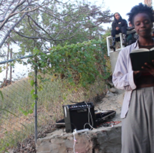 A highlight of the first day was the piece by Jasmine Nyende—a poet, musician, and model who merges these talents in her performance work. She stood on the stairs leading to the backyard, sound system at bay and books in hand. Speaking, “reading,” and almost singing, Jasmine shared segmented emotions of what it is to be her. By witnessing her thoughts and observations, we might decipher something about our own world. The piece ended with Jasmine’s riff upon an electric guitar.
