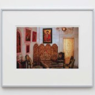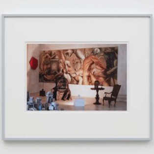 For the exhibition a small theatre space was created in the center of the gallery. Along the perimeter of the space are twenty color photographs from 1982 documenting the artworks in Iolas’ villa. The photographs are straightforward albeit grainy snapshots of artworks in situ that clearly illustrate the idiosyncrasies in Iolas’ collecting. In one photograph, Jones captures paintings by Matta and Rene Magritte nestled in overcrowded bookshelves between art books and classical Greek vases. These uncanny juxtapositions— modern and ancient art with ornate furniture, chandeliers and tapestries— are interspersed with images of Iolas’ sexually explicit pieces.