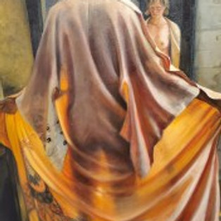 Jodi Bonassi offers gorgeous images of community, lush and crowded canvasses that tell a story of life that embodies magical realism with grace and passion. Hers is a robust universe of both corporeal women and the fanciful spirit within them. In her 30 x 40 “Arts District,” the oil on canvas images are both dreamlike and grounded in urban experience, one in which a smaller figure holds a sign aloft that admonishes the viewer to “Make Art.” It is a beautiful cornucopia packed with radiant life.